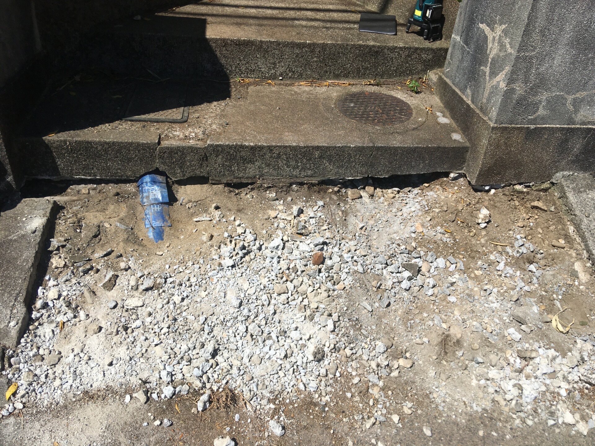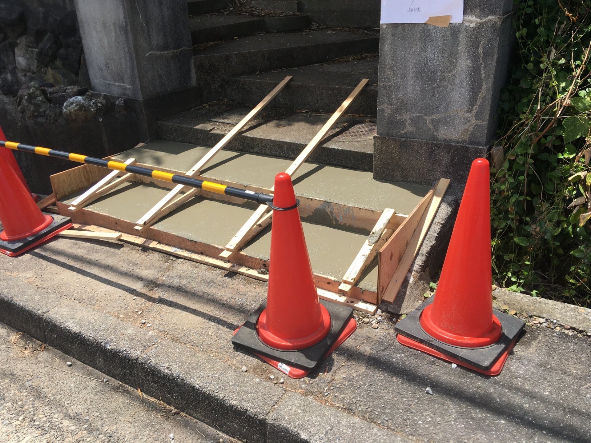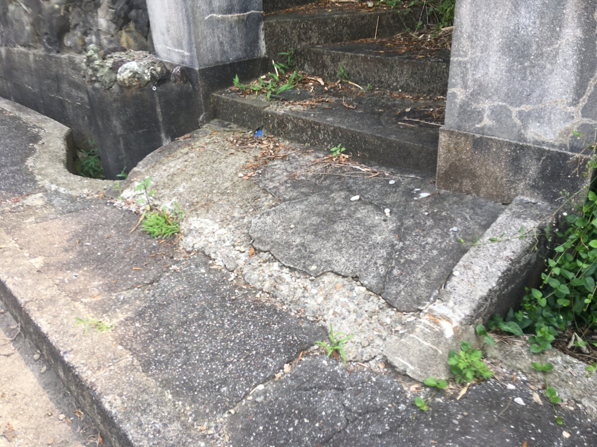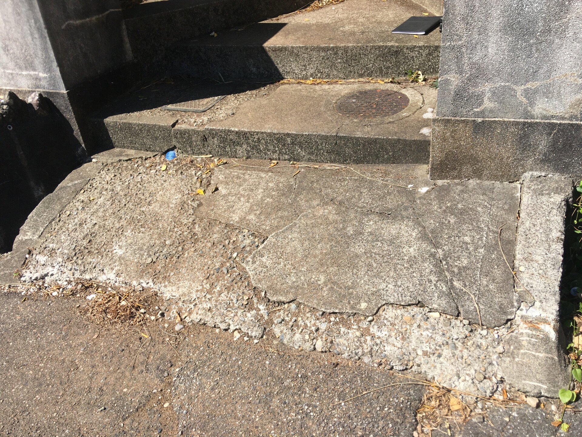 古いアプローチ階段で、最下部がスロープ状になっています。